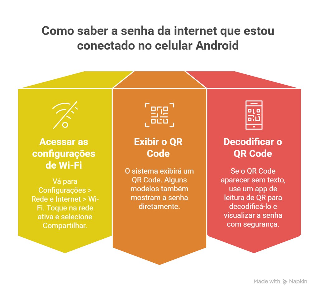 O caminho pode variar levemente conforme a marca (Samsung, Motorola, etc.), mas a lógica é a mesma: acessar as configurações da rede conectada para buscar a opção de compartilhamento ou QR Code.