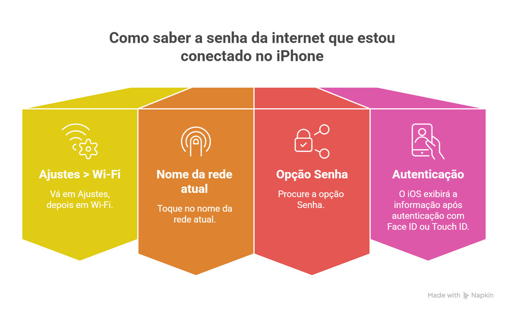 No iPhone, descobrir como saber a senha da internet que estou conectado é simples: vá em Ajustes > Wi-Fi, toque no nome da rede atual e procure a opção Senha.
